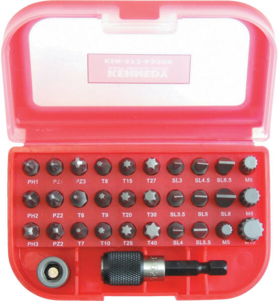 Kereszthornyos: No. 1, 2 és 3. Pozidriv: No. 1, 2 (x2) és 3. Torx: T6, 7, 8, 9, 10, 15, 20, 25, 27, 30 és 40. Hornyos: 3, 3.5, 4, 4.5, 5, 5.5, 6.5 és 8 mm XZN: 5, 6, 8 és 10mm. 1/4" hatszög x 60 mm gyorscsatlakozós, mágneses bitbehajtó 1/4" négyszög 1/4" hatszög mágneses bitbehajtó.