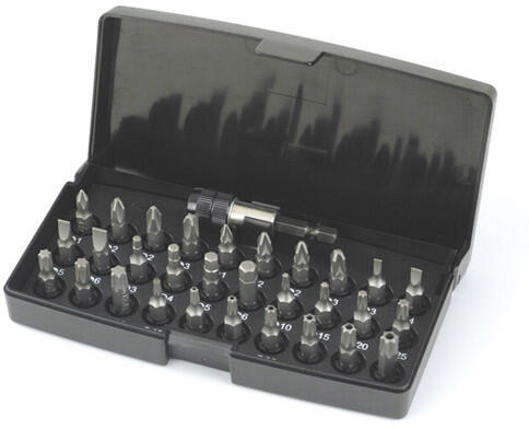 Bitbehajtó készlet 1/4" bit befogás Acél Műanyag tartó doboz Készlet tartalma: 1 db PH1x25 mm bitbehajtó 2 db PH2x25 mm bitbehajtó 1 db PH3x25 mm bitbehajtó 1 db PZ1x25 mm bitbehajtó 2 db PZ2x25 mm bitbehajtó 1 db PZ3x25 mm bitbehajtó 1 db lapos (SL) 3 mm bitbehajtó 1 db lapos (SL) 4 mm bitbehajtó 1 db lapos (SL) 5 mm bitbehajtó 1 db lapos (SL) 6 mm bitbehajtó 1 db imbusz (HEX) 3x