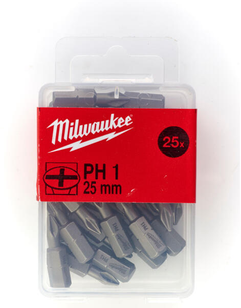 MILWAUKEE Bithegy PH1 x 25 mm (25 db/cs) A testet a legmagasabb fokú, S2 európai acélból készítik. "Minőség" jel. Minden bitet lézeres eljárás során Milwaukee®, logóval és a könnyű azonosítás végett hegy befogóval látnak el. Hidegen formázott fej a pontos és csúszásmentes illeszkedésért. A hegy speciális folyamat során, 870 °C-on edzett. A végeredmény egy 60 HRC-s
