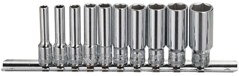 Genius Tools - Canada 10 db-os 1/4-es dugókulcs készlet 6 lapú, hosszított kivitel, colos méretezésben Méretek: 3/16, 7/32, 1/4, 9/32, 5/16, 11/32, 3/8, 7/16, 1/2, 9/16" Tartó sínre rögzítve