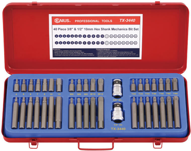 Befogás: 10mm Bitek (30mm és 75mm): 7+7db metrikus imbusz bit; méret: 4, 5, 6, 7, 8, 10, 12mm, 7+7db külső torx bit; méret T 20, 25, 30, 40, 45, 50, 55, 5+5db XZN (spline) bit; méret: M 5, 6, 8, 10, 12, 1db 3/8" befogó 10mm-es bithez 1db 1/2" befogó 10mm-es bithez Tartozék : piros fém doboz Hosszúság : 30-75 mm Anyag : High Speed Steel (HSS) - nagy sebességű acél. Magas fordulatsz