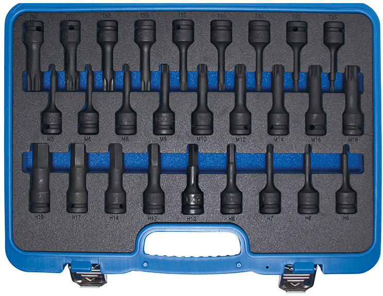 Jellemzők: alkalmas kézi és ütvecsavaros csavarkulcsok használatára rögzítőcsapos és gumigyűrűs befogóval T-profil méretek (Torx): T25 - T30 - T40 - T45 - T50 - T55 - T60 - T70 - T80 Belső hatszögletű méretei: 5 - 6 - 7 - 8 - 10 - 12 - 14 - 17 - 19 mm Belső fogazású méretei (XZN): M5 - M6 - M8 - M9 - M10 - M12 - M14 - M16 - M18 Szállítási terjedelem: T-profil (Torx) Leveg