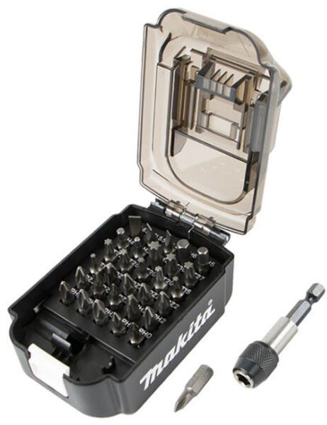 Makita LXT akku alakú bit készlet 31db-os 31 darabos bitkészlet 1/4"-os A készlet tartalma: 25 mm-es bit hosszúság: 1 db PH0 1 db PH1 4 db PH2 1 db PH3 1 db PZ0 1 db PZ1 4 db PZ2 1 db PZ3 1 db T10 1 db T15 2 db T20 2 db T25 1 db T27 1 db T30 1 db T40 1 db HEX3 1 db HEX4 1 db HEX5 1 db HEX6 1 db SL4.5 1 db SL5.5 1 db SL6.5 1 db mágneses bittartó 60 mm A doboz a leggyakrabban használt bit t