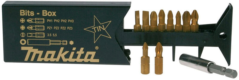 Makita Titánium bit készlet 10 részes Extra kemény titánium bitek Praktikus, csavarhúzóként használható műanyag tok Övcsipesz Leszállított tartozékok: 25mm -es lapos bitek: 3,5mm 1db 5,5mm 1db 25mm-es Philips bitek: PH1 1db PH2 2db PH3 1db 25mm-es pozidriv bitek: PZ1 1db PZ2 2db PZ3 1db Bittartó 60mm