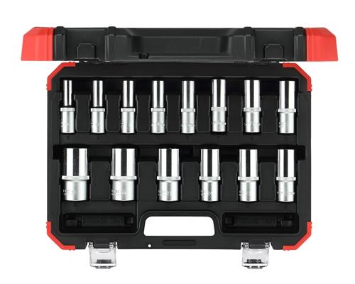 Négyszög meghajtás a DIN 3120 - C 12.5, ISO 1174 szerint, gömbcsukló hornyokkal 1/2 " hatszög kialakítás, metrikus, hosszított, DIN 3124, ISO 2725 szerint Króm-vanádium acél, krómozott matt felület Kézi meghajtáshoz Műanyag dobozban, GedoreRed design Méretek: 10 12 13 14 15 17 19 21 22 23 24 27 30 32 mm Dugó hossz: 77 mm