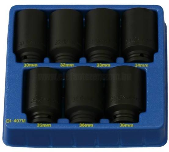 Anyaguk: Chrome Molybdenum acél Felületük: feketített Csatlakozás: 1/2" 6-lapú, hosszított, vékony falú kivitel. Súly: 3750 g A 7 részes készlet tartalma: Cikkszám Méret D1 D2 Hossz 44783030 mm42 mm30 mm78 mm44783232 mm45 mm30 mm78 mm44783333 mm46 mm35 mm78 mm44783434 mm48 mm35 mm78 mm44783535 mm48 mm35 mm78 mm44783636 mm50 mm35 mm78 mm44783838 mm52 mm35 mm78 mm Kék műanyag tartób