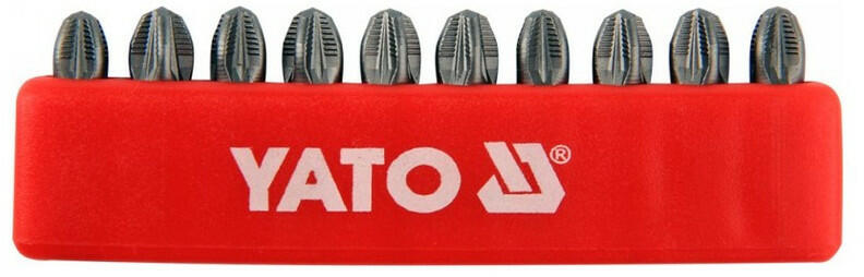 Gyártó : Yato Termék típusa : Csavarhúzó bit készlet Darabszám a készletben : 10 db Anyag : S2 acél Bit típus : Pozidriv (PZ) Bit méret : PZ3 Bit hossza : 25 mm Bit foglalat mérete : 1/4" (6.3 mm) Felületkezelés : homokfúvott Jellemzők : Magas minőségű S2 acél, amely hosszú élettartamot biztosít. Ideális különféle csavarozási feladatokhoz.