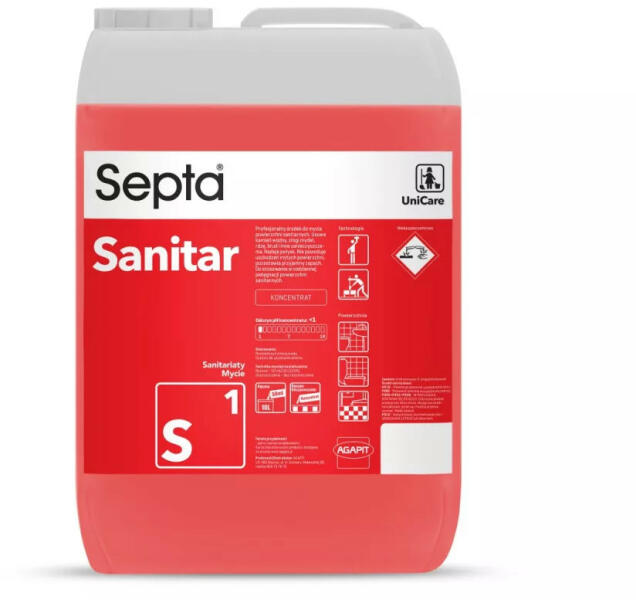 Szaniter tisztítószer napi takarításhoz és eseti nagytakarításhoz. Vízes helyiségekben való használatra tervezett tisztítószer, mely megkönnyíti a lerakódott szennyeződések eltávolítását. A Septa Sanitar S1 egy professzionális tisztítószer szaniter felületek tisztítására. Eltávolítja a vízkővet, szappanlerakódásokat, rozsda foltokat és egyéb szennyeződéseket.