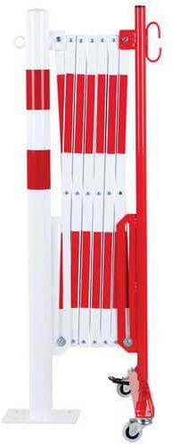Összecsukható acélkorlát kerekekkel, kerek oszloppal. Kétszínű csíkok a jobb láthatóság érdekében. Kizárólag beltéri használatra. Könnyen mozgatható, tárolható és használható a fékezett kerekeknek köszönhetően.