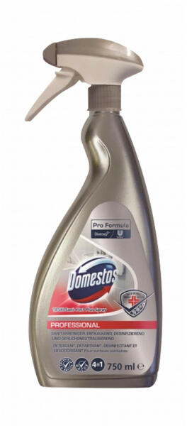 A Domestos Pro Formula 4in1 Washroom Spray (TASKI® Sani 4in1 Plus Spray) kombinált fürdőszoba tisztító, vízkőtelenítő, fertőtlenítő és illatosító a mosdó összes saválló kemény felületéhez. 60 másodperc alatt elpusztítja a burkos vírusok (beleértve a koronavírusokat) 99,99% -át, és 5 perc alatt megszünteti a baktériumok 99,999% -át. Tulajdonságok - 4in1 formula: ti