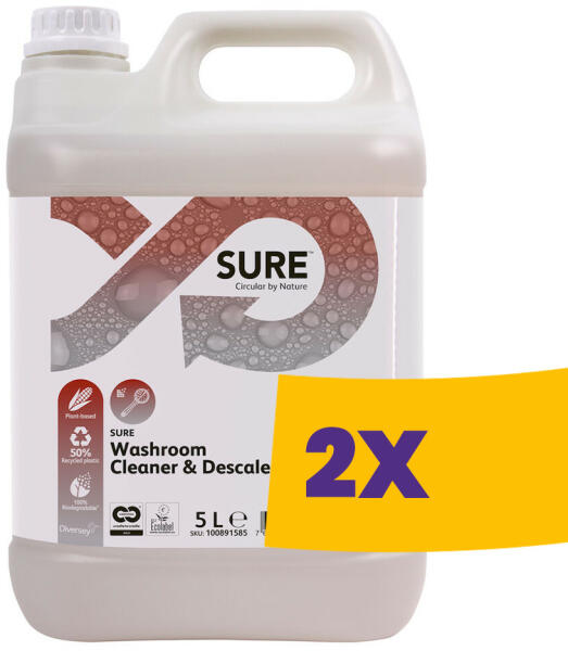 Fürdőszobai tisztító- vízkőoldószer, növényi alapú, 100%-osan lebomló A SURE Washroom Cleaner & Descaler az egyedi SURE termékkör tagja, mely 100%-osan lebomló*, növényi alapú összetétellel rendelkező professzionális tisztítószereket kínál mindennapi takarítási feladatok elvégzésére. A SURE Washroom Cleaner & Descaler egy fürdőszobai tisztító- és vízkőo