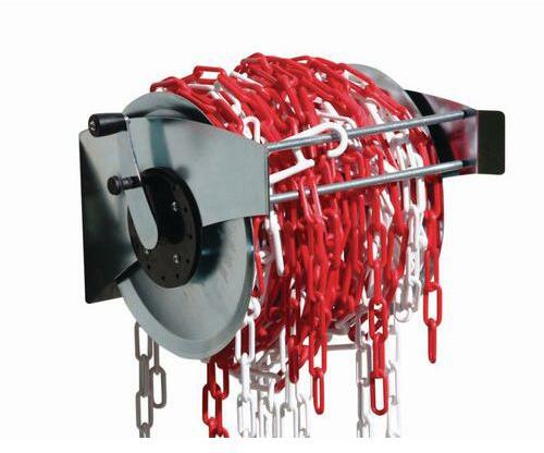 Sorompó láncelemekkel az optimális láthatóság érdekében. Átmenetileg kijelöli a korlátozott hozzáférésű területeket. Falra szerelhető, vagy kampós oszlopra rögzíthető.