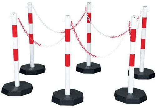 Mozgatható talpas fűzőszemes oszlopokból és műanyag láncból álló készlet.