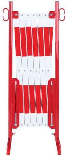 Összecsukható acél korlát, 2 oldalán lábakkal veszélyes területek ideiglenes lezárásához. Váltakozó színei figyelmeztetnek a veszélyre. A korlátok egymással összekapcsolhatók. Szétszedve helytakarékosak.