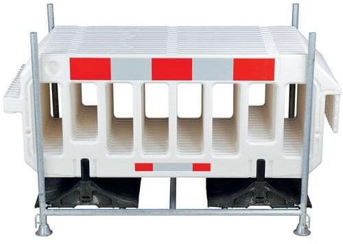 Terek ideiglenes lezárására szolgáló mobil terelőkorlátból és hordozóállványból álló készlet. Kampóval és fűzőszemmel ellátva, több korlát összekapcsolására egymás után vagy négyzetbe. Fényvisszaverő csíkok az optimális láthatóságért. Horganyzott tárolóállvány, amely targoncával vagy raklapemelővel is mozgatható. Kültéri használatra alkalmas.