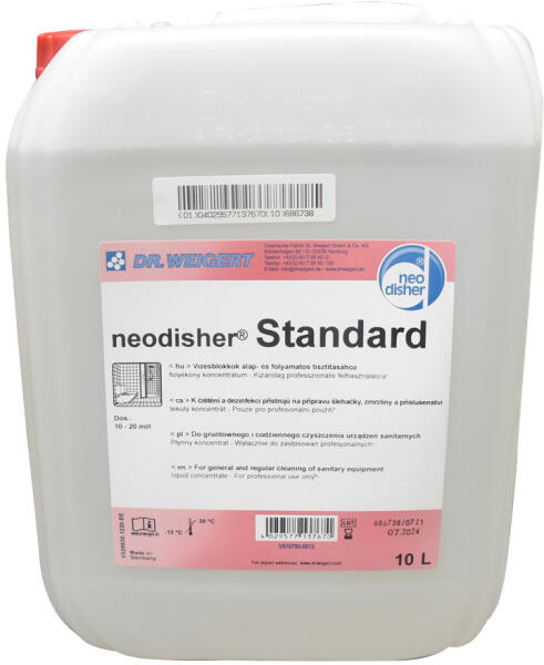 Hatékony, sósavmentes tisztítószer minden típusú szaniterekhez. Eltávolítja a vízkövet, a szappanmaradványokat és a makacs szennyeződéseket. Biztonságos a legtöbb felületre. A Dr. Weigert neodisher Standard egy erőteljes, ugyanakkor kíméletes tisztítószer, amely kifejezetten szaniterek tisztítására lett kifejlesztve. Sósavmentes formulája garantálja a biztonságos haszn