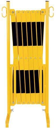 Összecsukható acél korlát, 2 oldalán lábakkal veszélyes területek ideiglenes lezárásához. Váltakozó színei figyelmeztetnek a veszélyre. A korlátok egymással összekapcsolhatók. Szétszedve helytakarékosak.
