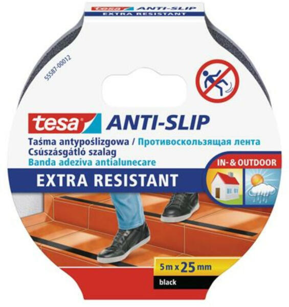 Csúszásgátló szalag, 25 mm x 5 m, TESA Anti-slip, fekete (TE55587F) A tesa® csúszásgátló szalag extra biztonságot kínál csúszós padlók esetén. Ideális lépcsőkhöz, rámpákhoz, létrákhoz, hajótestekhez és más kritikus felületekhez. Rendkívül erős és tartós szalag Rendkívül erős tapadás Kézzel téphető Ellenáll a víznek, a hőnek, az UV-sugárzásnak és a tisz