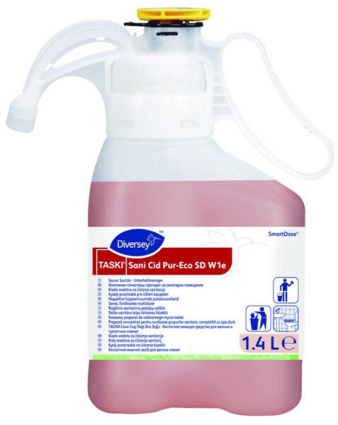 Eco címkével ellátott, citromsav alapú fürdőszobai tisztítószer koncentrátum. A TASKI Sani Cid SmartDose egy citromsav alapú szuperkoncentrátum, napi tisztítószer minden típusú sav- és vízálló felületre. Citromsav alapú enyhén savas tisztítószer Alkohol és természetes növényi eredetű felületaktív anyagok hatékony kombinációján alapul, mely minimalizálja a körny