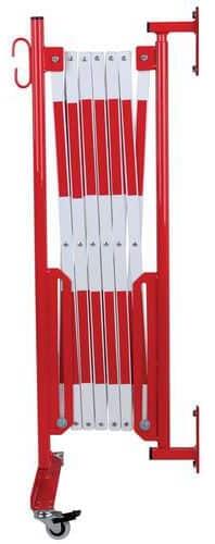 Összecsukható acélkorlát kerekekkel, fali rögzítéssel a forgalom ideiglenes lezárásához. Kétszínű csíkok a jobb láthatóság érdekében. Kizárólag beltéri használatra. Könnyen mozgatható, tárolható és használható a fékezett kerekeknek köszönhetően.