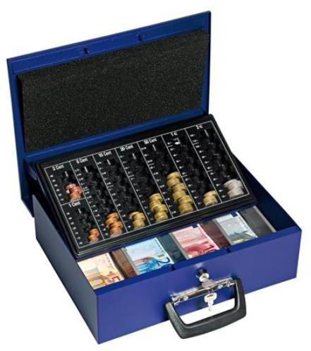 erős pénzkazetta porszórt acélból Euro bankjegyek és érmék részére vastag fedél belül, ami megakadályozza hogy az érmék kiessenek a helyrükről szállítás közben biztonsági zár 2 kulccsal kapacitás: 225,7 € érméknek fogantyúval és négy rekesszel a bankjegyeknek méret: 355 x 27,5 x 10 cm tömeg: 4,721 kg szín: kék
