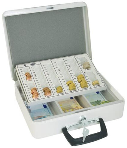 erős pénzkazetta porszórt acélból Euro bankjegyek és érmék részére vastag fedél belül, ami megakadályozza hogy az érmék kiessenek a helyrükről szállítás közben biztonsági zár 2 kulccsal kapacitás: 125,75 € érméknek fogantyúval és három rekesszel a bankjegyeknek méret: 31,5 x 24,5 x 9,5 cm tömeg: 2,29 kg