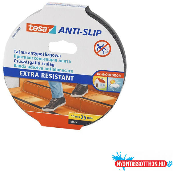 Csúszásgátló szalag 25mmx15 m Tesa fekete A tesa® csúszásgátló szalag okos és hatékony eszköz a le- vagy elesés megakadályozásának lépcsőfokokon, rámpákon, csúszós padlókon és hajótesteken. Segít megelőzni a baleseteket. Erős és tartós tapadást biztosít, emellett UV-sugárzásálló és rendkívül ellenáll a víznek, az extrém hőmérsékletnek és a tisztítósz