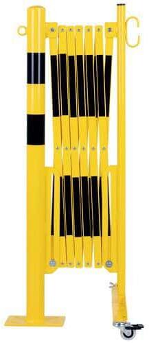 Összecsukható acélkorlát kerekekkel, kerek oszloppal. Kétszínű csíkok a jobb láthatóság érdekében. Kizárólag beltéri használatra. Könnyen mozgatható, tárolható és használható a fékezett kerekeknek köszönhetően.