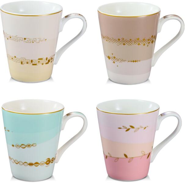 A myCOFFEE teásbögrék és kávéscsészék vékonyfalú „New Bone porcelánból készültek, amely kivételes rendkívüli fehérségével és ellenállóságával. A négy bögréből álló készlet eredeti módon ötvözi a porcelán bögrék hagyományos formáját trendi dekorációval. Mikrohullámú sütőbe és mosogatógépbe is alkalmas.