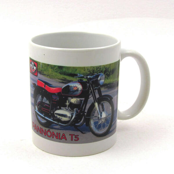 Kerámiából készült retro bögre Pannónia T5 fotóval. 2,5 deciliteres kerámia bögre retro járművel. A bögrén a kép szublimálási eljárással készült, ezért alkalmas mikrohullámú sütőben és mosogatógépben való használatra egyaránt. Emlékezz és mosolyogj!