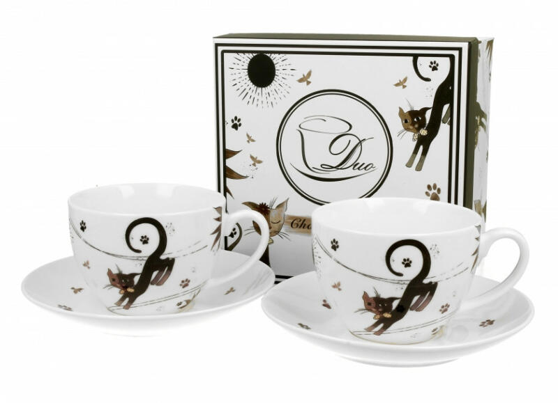Két 280 ml-es csészegarnitúra a CHARMING CATS sorozat részeként, aljával együtt, New Bone China porcelánból készült, melyet elegáns és természetes krémszínű-biankó szín jellemez finom fényezéssel, valamint kivételes tartóssággal. A vonalat tréfás macskák motívuma díszíti sötét, markáns színekben. Az egész kollekció egyszínű színpalettában és modern designba