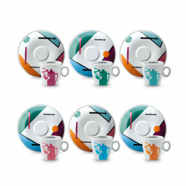 Hausbrandt Re-Design készlet 6x Cappuccino 120ml-hez 6 finom fehér porcelánból készült eszpresszó csésze "mokkával" hat színben és egy csészealj két grafikai változatban. RE-DESIGN CUP Vonalak, színek, tömör és üres formák apró titkokat rejtenek, mindezt egy kávészünet alatt kell felfedezni. Az új "Re-Design Cup" termékcsalád így néz ki: játékos újratervezés élén