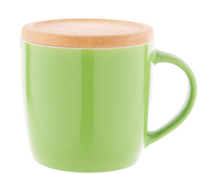 Magas minőségű színes kerámia bögre fehér belső résszel, bambusz alátéttel, 370 ml. Kraft papír dobozban szállítjuk.