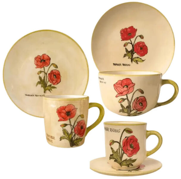 Reggeliző tányér- 2 db, kistányér -1 db , 2dl-es kávés, Jumbó és 4 dl-es teás bögrével. Anyaga: kerámia Szín:Színes mázalatti festék Bevonat: Károsanyag mentes, fényes máz. Készült: Égetéssel 1030 C-on Átmérő:19,5 cm 4dl Minden egyes darab egyedileg, kézzel készült és kézzel festett, emiatt előfordulhatnak apróbb eltérések, amelyek minden darabot még egyedibbé