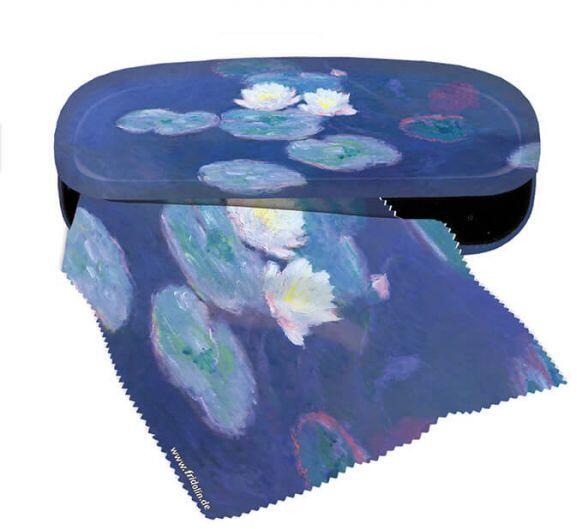 Monet Vízililiom festményével díszített szemüvegtartó tok törlőkendővel. Mérete: 16x4x6,5 cm. Anyaga: fém, textil bevonatú.