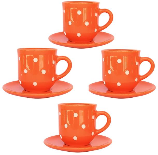 Kávés bögre és kistányér 8 db-os Bevonat: Károsanyag mentes, fényes máz. Készült: Égetéssel 1030 C-on Űrméret: 2,0 dl Kistányér átmérő:13,5 cm Mosogatógépben és mikróban is használható. Termék adatai Anyaga: kerámia Szín: narancs Bevonat: Károsanyag mentes, fényes máz. Készült: Égetéssel 1030 C-on Minden egyes darab egyedileg, kézzel készült és kézzel feste