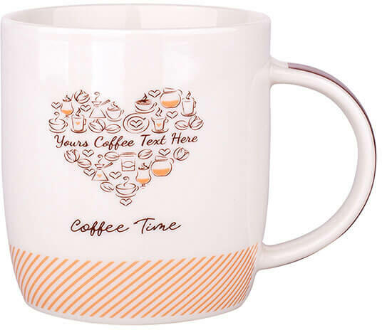 Stílusos kávésbögre a kávé szerelmeseinek! A dekoratív porcelán bögre kényelmes fogású füllel rendelkezik, vastag falainak köszönhetően hosszabb ideig melegen tartja a forró kávét. Lágy krém és barna színvilágú. Mintája: Coffe Time felirat, kávés grafikájú szív minta Yours Coffee Text Here felirattal. Bögre űrtartalma:300 ml. Mérete: 9,3x8,5 cm. Anyaga: kiváló m
