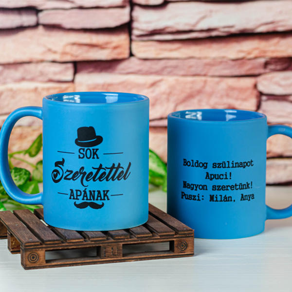 Egyedi matt kék bögre a legjobb édesapáknak :) Ha egyedi igazán ajándékot keresel édesapád számára, akkor remek választás lehet ez a kék bögre, melynek egyik felét egy kalap és bajusz díszíti. Ezek a férfias motívumok kerülnek kiegészítésre az általad megadott pár soros felirattal, amelyek a bögre túloldalán kapnak helyet. A bögre grafikája a SOK SZERETETTEL APÁNAK