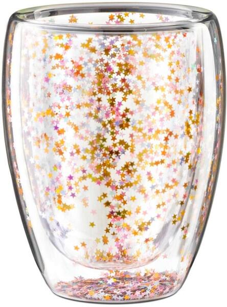Nagyon aranyos, csillogó csillagos glitterek a dupla falak között. Ez a csillogó pohár különleges kiegészítője lehet bármilyen stílusú konyhának, vagy irodai asztalnak. A dupla falak lehetővé teszik, hogy meleg vagy hideg italát kényelmesen, hosszabb ideig gond nélkül a kezében tartsa. 300 mlDupla falú üveg pohár csillogó glitterekkel, a jobb szigetelés érdekében, valam
