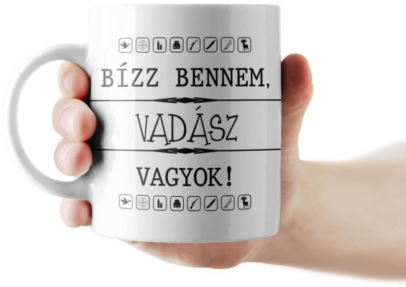 Fedezd fel egyedi stílusú a "Bízz bennem, vadász vagyok!" feliratos bögréinket! Készültünk egy különleges bögrével, mely a vadászat iránti elkötelezettségedet és szenvedélyedet hivatott kifejezni. ez a bögre nemcsak praktikus reggeli vagy délutáni italfogyasztáshoz, de egyben egy humoros stílusnyilatkozat is. Legyen saját részre vagy a kedvenc vadászodnak szánt ajándé
