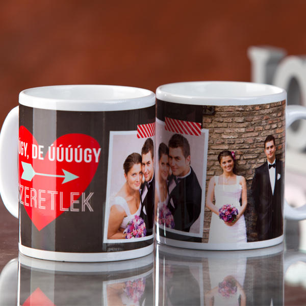 Ha szeretné valami különlegesebb ajándékkal meglepni párját Valentin nap alkalmából, akkor remek meglepetés lehet egy szívecskével és 2 db fényképpel ellátott egyedi fényképes bögre, amely grafikájában a boldogságot és szerelmet szimbolizálja. A fényképes bögre 3dl-es, mikrózható és mosogatógépben is mosható, azonban ajánljuk inkább a bögre kézi elmosását.