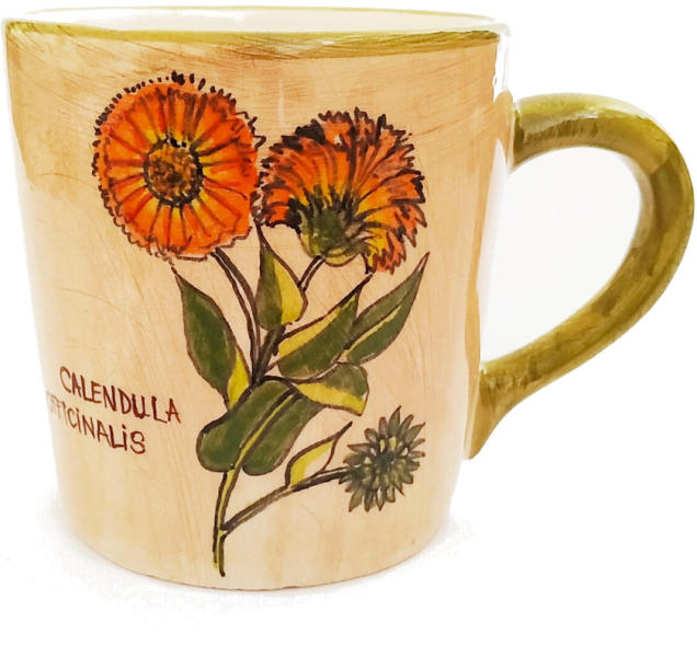 A vidéki kertek kedves gyógynövénye az orvosi körömvirág. A reggeli teát, frissítő citrommal és mézzel élvezze a 4dl bögrénkből. Termék adatai Anyaga: kerámia Szín:Színes mázalatti festék Bevonat: Károsanyag mentes, fényes máz. Készült: Égetéssel 1030 C-on Űrméret: 4 dl Minden egyes darab egyedileg, kézzel készült és kézzel festett, emiatt előfordulhatnak apró