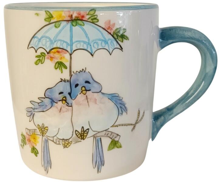 Kézzel festett Szerelmes madárpár bögre . Termék adatai: Anyaga: kerámia Szín: Máz alatti festés Bevonat: Károsanyag mentes, fényes máz. A Szerelmes madárpár bögre 1030 C-on készül, égetéses módszerrel. Minden egyes darab egyedileg, kézzel készült és kézzel festett, emiatt előfordulhatnak apróbb hibák, amelyek minden darabot még egyedibbé és különlegesebbé tesznek