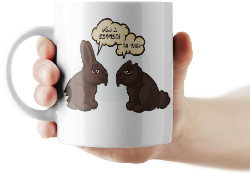 Fáj a seggem húsvéti bögre. Humoros "Fáj a seggem. - Mi van?" feliratos és csokinyulakat ábrázoló ünnepi ajándék. Fáj a seggem húsvéti bögre. Humoros "Fáj a seggem. - Mi van?" feliratos és csokinyulakat ábrázoló ünnepi ajándék. Anyag és méret: kerámia, 3dl
