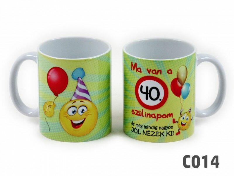 Bögre 40. Szülinapom 3dl C014 04335 - Szülinapos bögre A bögréink fényes felületűek és élénk színűek. Kézzel és mosogató gépben is mosható. Űrtartalma 3dlBefogó méretei 8 cm x 9,5 cmSúlya 0.35 kgAnyaga kerámia