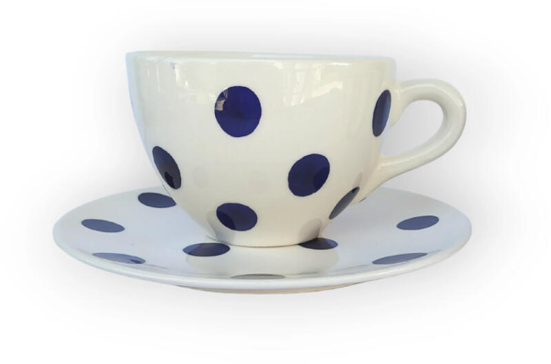Kék pöttyös kisjumbo bögre és reggeliző tányér Anyaga: kerámia Szín:Máz alatti festék, 1030C-on égetett mázzal bevonva. Űrméret:5dl Tányér átmérő:19,5 cm Termék adatai Anyaga: kerámia Szín:Máz alatti festék, 1030C-on égetett mázzal bevonva. Bevonat: Károsanyag mentes, fényes máz. Készült: Égetéssel 1030 C-on Minden egyes darab egyedileg, kézzel készült és ké