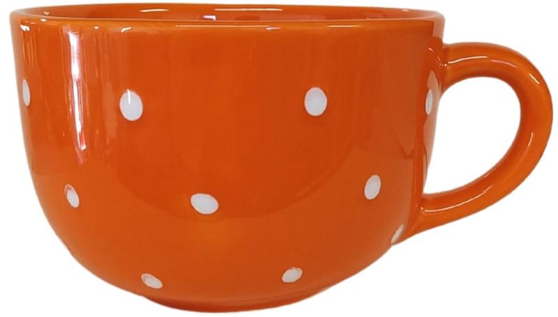 Narancs alapon fehér pöttyös Jumbo bögre Termék adatai Anyaga: kerámia Szín: narancs Bevonat: Károsanyag mentes, fényes máz. Készült: Égetéssel 1030 C-on Űrméret: 6,5 dl Mosogatógépben és mikróban is használható. Termék adatai Anyaga: kerámia Szín: narancs Bevonat: Károsanyag mentes, fényes máz. Készült: Égetéssel 1030 C-on Űrméret: 6,5 dl Minden egyes darab egyed