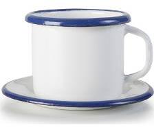 Zománc bögre tálcával, kék csíkkal díszítve.