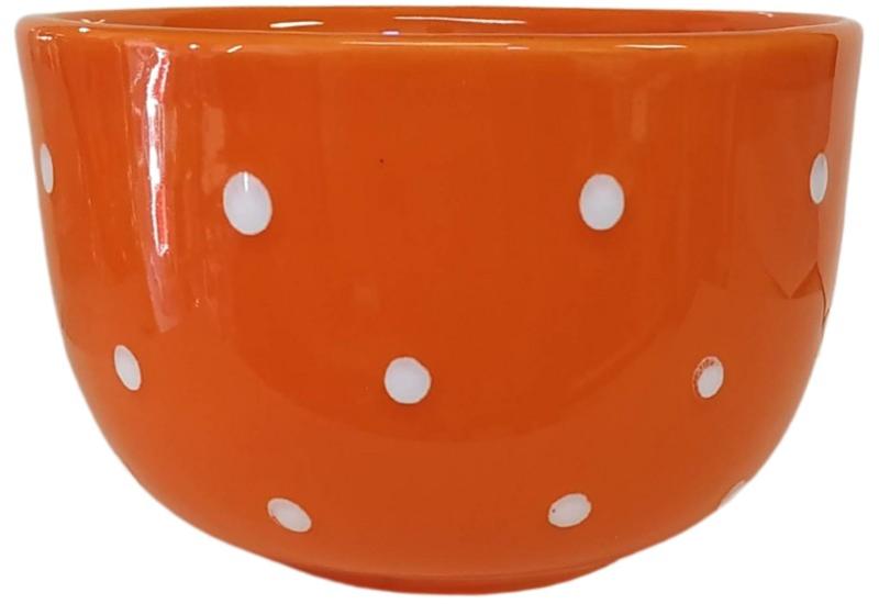 Narancs alapon fehér pöttyös Műzlis tál Termék adatai Anyaga: kerámia Szín: narancs Bevonat: Károsanyag mentes, fényes máz. Készült: Égetéssel 1030 C-on Űrméret: 6,5 dl Mosogatógépben és mikróban is használható. Termék adatai Anyaga: kerámia Szín: narancs Bevonat: Károsanyag mentes, fényes máz. Készült: Égetéssel 1030 C-on Űrméret: 6,5 dl Minden egyes darab egyed