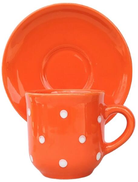 Narancs alapon fehér pöttyös Kávés bögre és kistányér Bevonat: Károsanyag mentes, fényes máz. Készült: Égetéssel 1030 C-on Űrméret: 2,0 dl Kistányér átmérő:13,5 cm Mosogatógépben és mikróban is használható. Termék adatai Anyaga: kerámia Szín: narancs Bevonat: Károsanyag mentes, fényes máz. Készült: Égetéssel 1030 C-on Űrméret: 2,0 dl Minden egyes darab egye